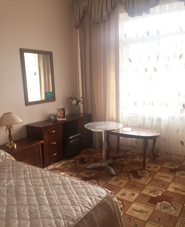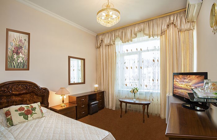 Площадь номера - 15 кв.м. 1 осн. место. Балкон. Мебель: зеркало, кровати односпальные, прикроватные тумбочки, столик журнальный, столик туалетный, шкаф. Оборудование: кондиционер, мини-холодильник, набор посуды, сейф, телевизор, телефон, электрочайник. Санузел: с душем, тапочки, фен, халат. Сервис: Wi-Fi платно, смена полотенец, смена постельного белья, уборка номера.