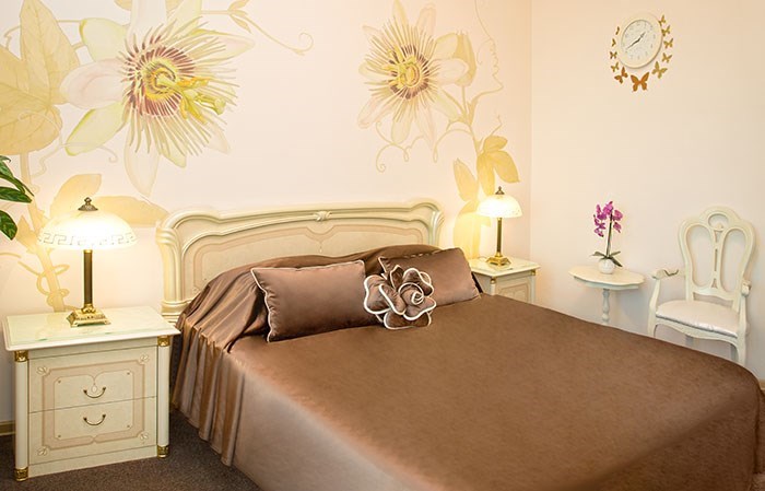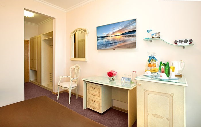 Площадь номера - 15 кв.м. 1 осн. место. 1 доп. место. Балкон. Мебель: вешалка, зеркало, кровать двуспальная, стол, стулья, тумба, шкаф. Оборудование: кондиционер, пляжные полотенца, телевизор, холодильник. Санузел: с ванной или душевой кабиной, тапочки, туалетные принадлежности, фен, халат. Сервис: Wi-Fi платно, смена полотенец, смена постельного белья, уборка номера, услуги внутренней телефонной связи.