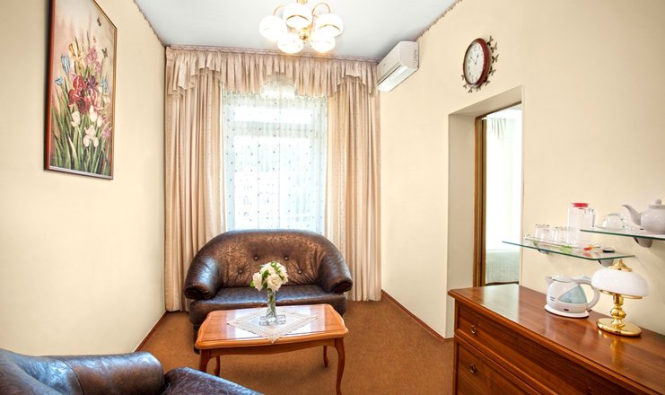 Площадь номера - 30 кв.м. 2 осн. места. 1 доп. место. Мебель: диван, зеркало, комод, кресло, кровати односпальные /одна двуспальная кровать, прикроватные тумбочки, столик журнальный, шкаф. Оборудование: кондиционер, мини-холодильник, набор посуды, сейф, телевизор, телефон, электрочайник. Санузел: с душем, тапочки, фен, халат. Сервис: Wi-Fi платно, смена полотенец, смена постельного белья, уборка номера.