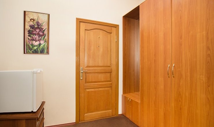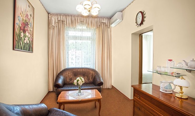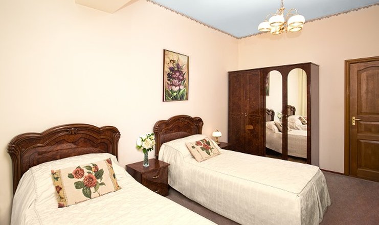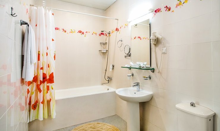 Площадь номера - 30 кв.м. 2 осн. места. 2 доп. места. Балкон. Мебель: диван, зеркало, комод, кресло, кровати односпальные /одна двуспальная кровать, прикроватные тумбочки, столик журнальный, шкаф. Оборудование: кондиционер, мини-холодильник, набор посуды, сейф, телевизор, телефон, электрочайник. Санузел: с душем, тапочки, фен, халат. Сервис: Wi-Fi платно, смена полотенец, смена постельного белья, уборка номера.