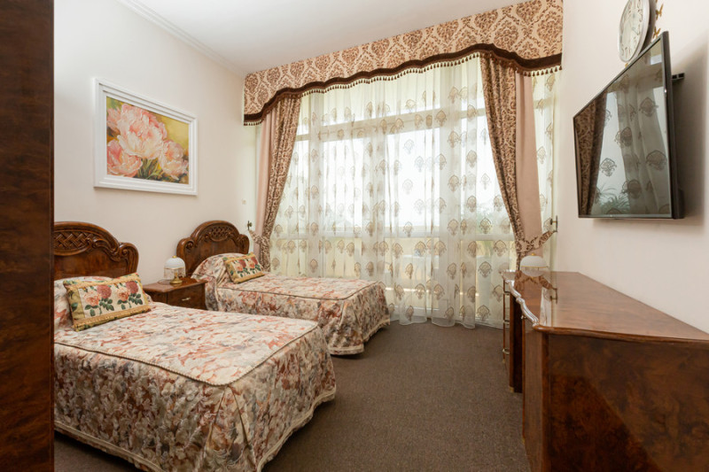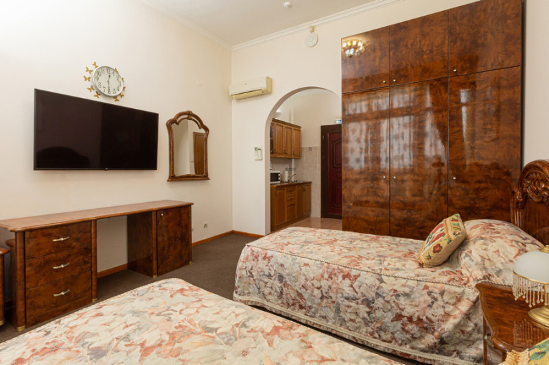 Площадь номера - 20 кв.м. 2 осн. места. 1 доп. место. Мебель: вешалка, зеркало, кровати односпальные, стулья, тумба, шкаф. Оборудование: кондиционер, набор посуды, пляжные полотенца, телевизор, телефон, холодильник. Санузел: с ванной или душевой кабиной, тапочки, туалетные принадлежности, фен, халат. Сервис: Wi-Fi платно, смена полотенец, смена постельного белья, уборка номера, услуги внутренней телефонной связи.